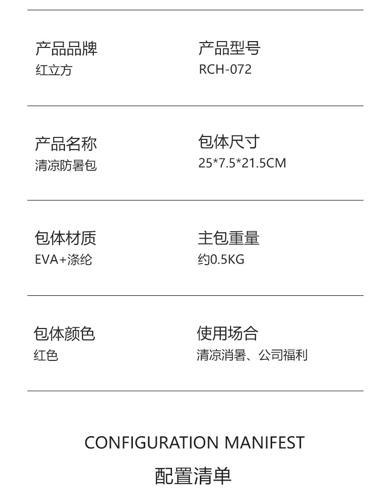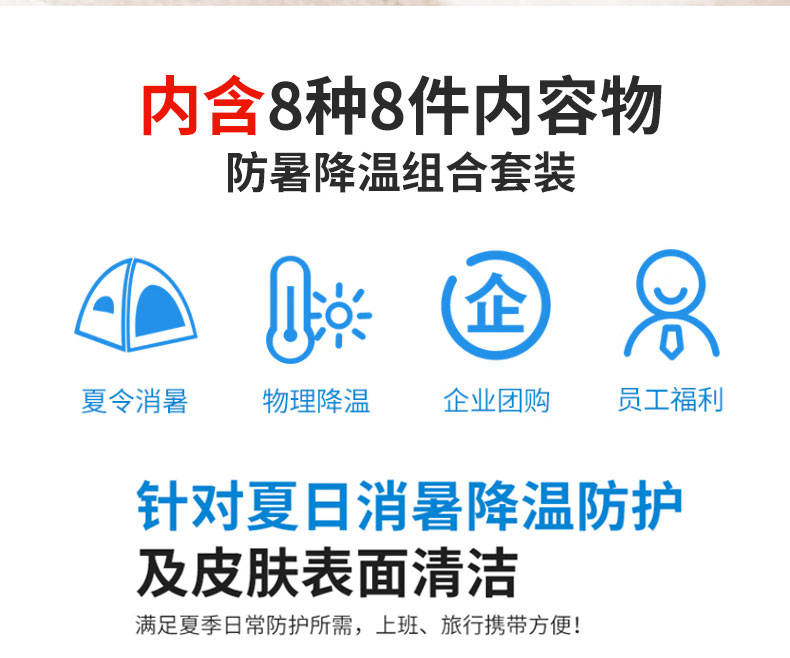 紅立方始終秉承著“讓我們生活地更安全”理念,為應(yīng)對(duì)暑伏安全,特研發(fā)清涼防暑包套裝,內(nèi)含物理降溫,清涼防暑,潔面親膚,消菌防護(hù),皮膚清潔抑菌等產(chǎn)品。包體便于攜帶,方便戶外時(shí)使用,可定制logo。適用于員工福利發(fā)放,客戶禮品饋贈(zèng),個(gè)人家庭使用。